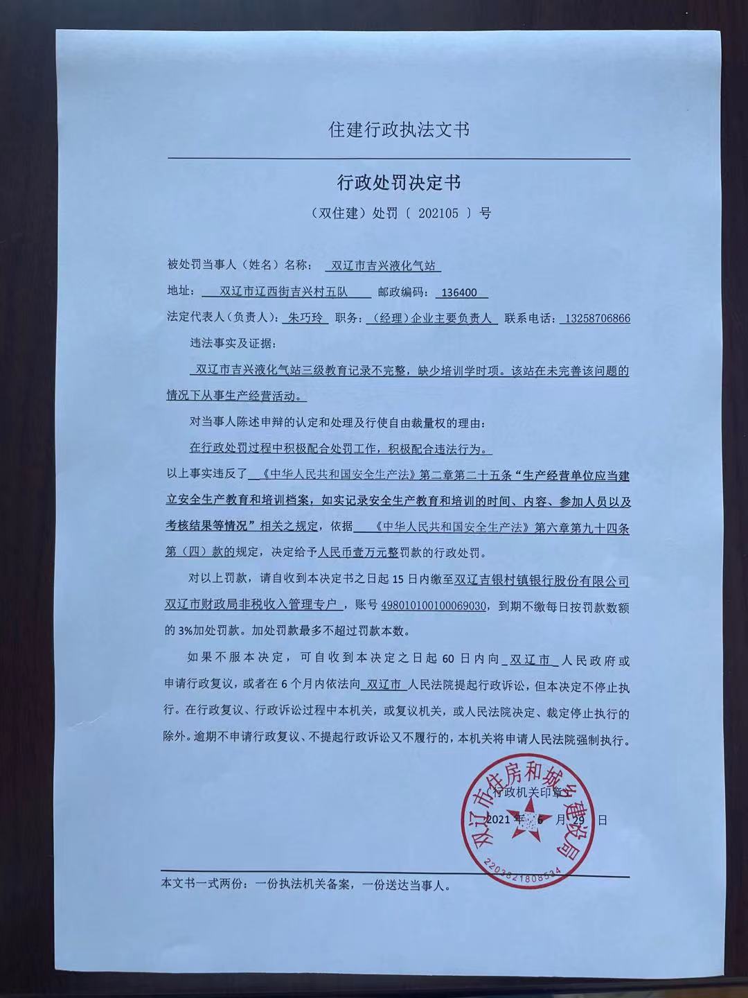 双辽市住房和城乡建设局行政处罚决定书(202105号)