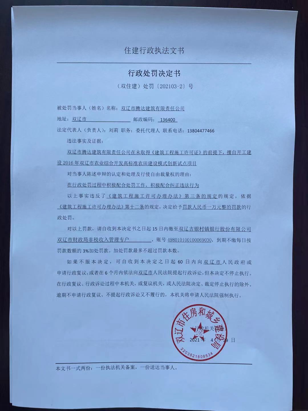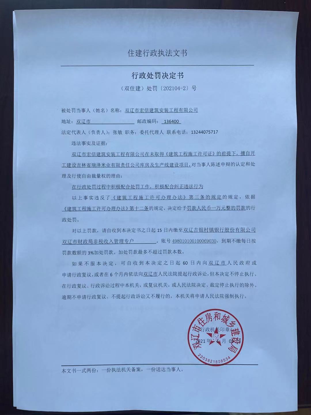 双辽市住房和城乡建设局行政处罚决定书(202104-2号)