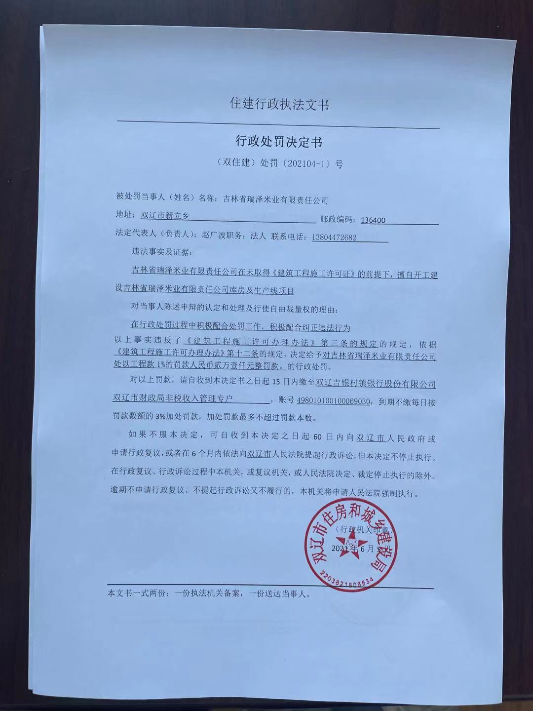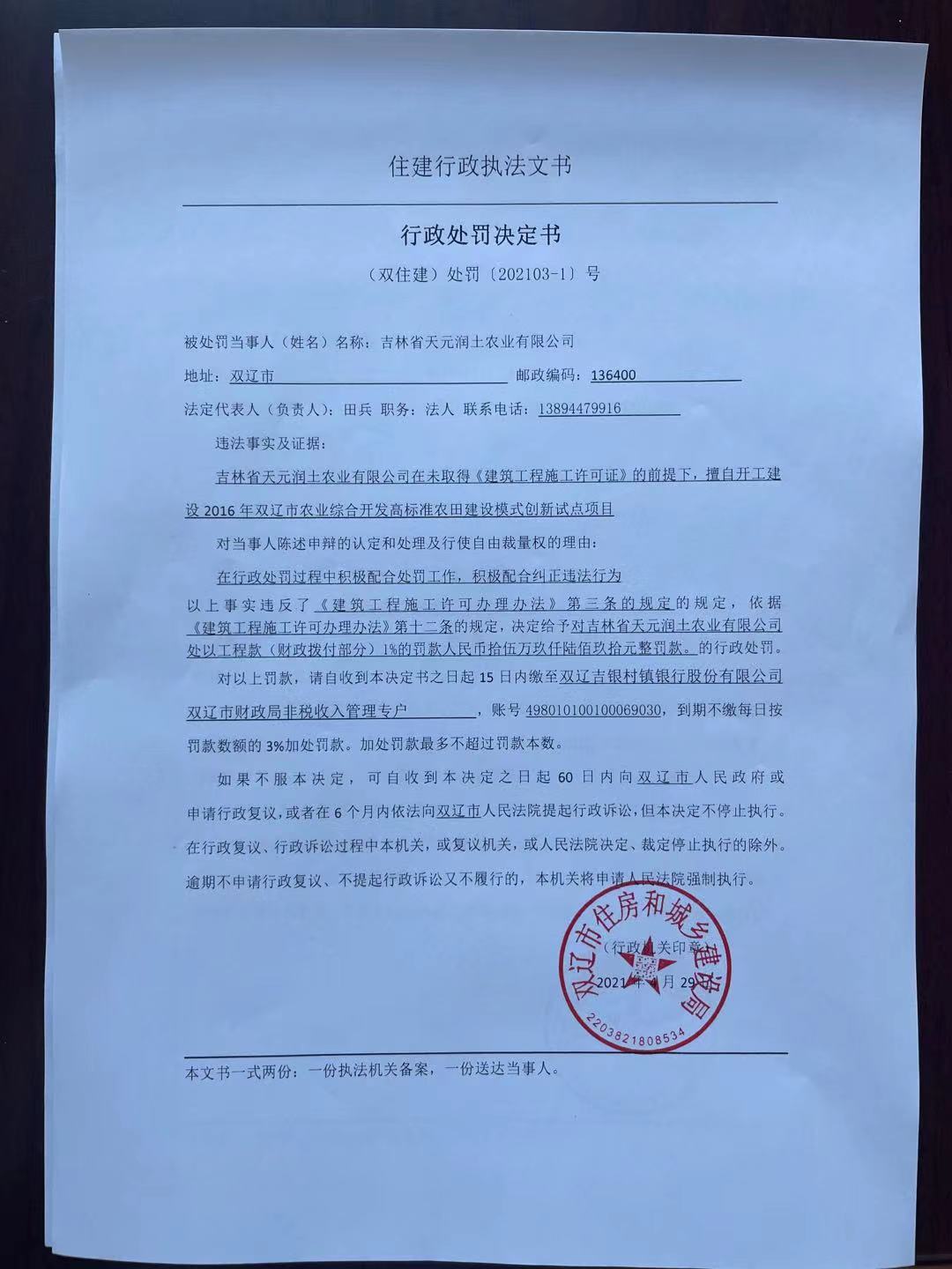 双辽市住房和城乡建设局行政处罚决定书(202104-1号)